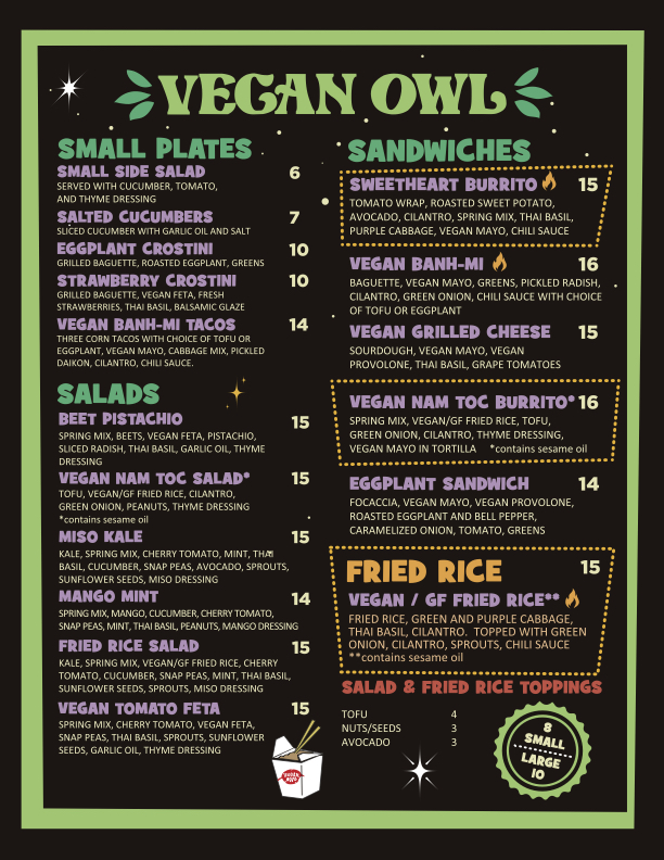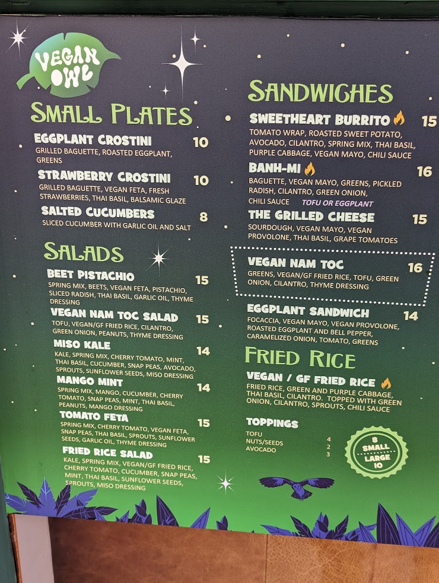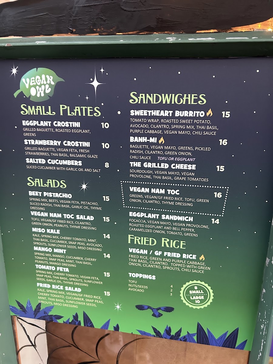 Welcome to The Blue Owl, a delightful culinary gem nestled in the heart of Santa Barbara at 5 W Canon Perdido St. This cozy eatery offers a vibrant menu that caters to diverse palates, featuring both carnivorous and plant-based options. Among the standout dishes are their refreshing salads, like the Vegan Nam Toc Salad and the Miso Kale Salad, each meticulously crafted with fresh ingredients.